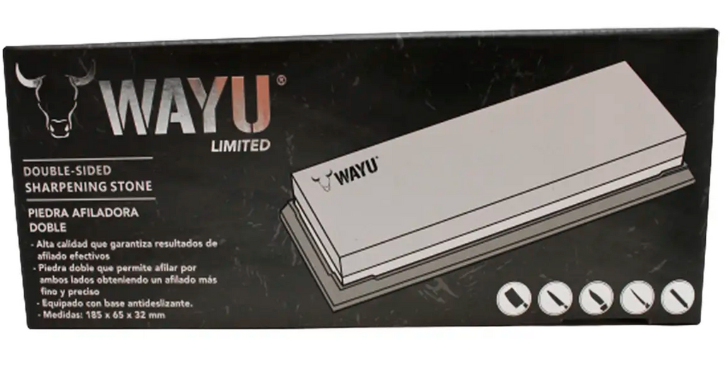 Piedra afiladora de la marca Wayu, utilizada para afilar herramientas y cuchillos. Usado en talleres y hogares, proporcionando un afilado eficiente y duradero.