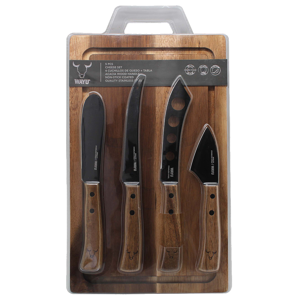 El set aperitivo Wayu incluye una tabla de madera de acacia de 33 cm x 20 cm x 15 mm y 4 cuchillos para diferentes tipos de cortes. Diseñado con atención a los detalles, es ideal para comidas cotidianas y ocasiones especiales, convirtiéndose en un accesorio indispensable para crear momentos memorables.