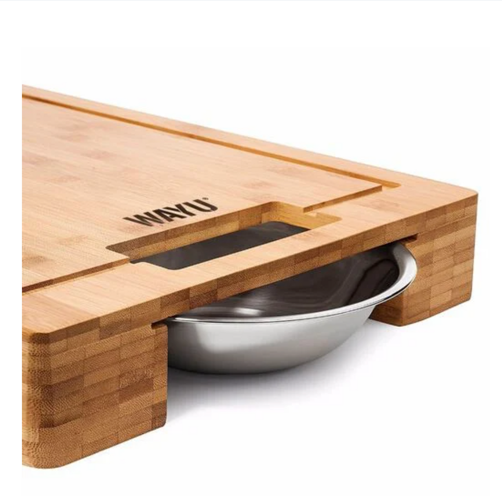 La Tabla Madera Bowl Acero Wayu es la solución ideal para realizar tus preparaciones de manera eficiente y elegante, permitiéndote cortar vegetales o carne y colocar los ingredientes en su práctico bowl integrado, que se puede retirar fácilmente.