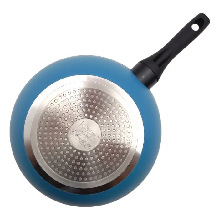 Sartén Wok de 28 cm ofrece una combinación perfecta de funcionalidad y estilo en la cocina moderna. Fabricada con un cuerpo de aluminio fundido de 3 mm de espesor, proporciona una distribución uniforme del calor para resultados de cocción óptimos. Su recubrimiento exterior en color azul no solo añade un toque estético, sino que también asegura durabilidad y resistencia.